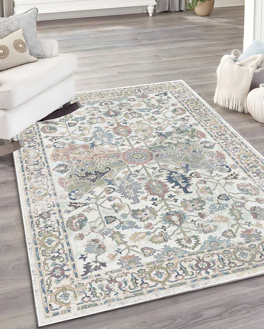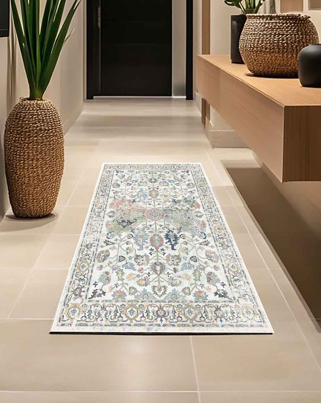 Duha is a vintage persian new style carpet has light Beige carpet background and mixture of floral and classic curves in the most trending and modern colours mixtures that can unfortunately change area mode and style ,it's the best choice for livingroom carpet , bedroom runners and bedroom carpet and door mat. Easy cleaning make it beats all other carpets as it's washable carpet ,  Enjoy softness touch with the best colours and anti-slip back would make it the best choice ever for high and  medium-traffic zones, kid and pet-friendly carpet and homes.